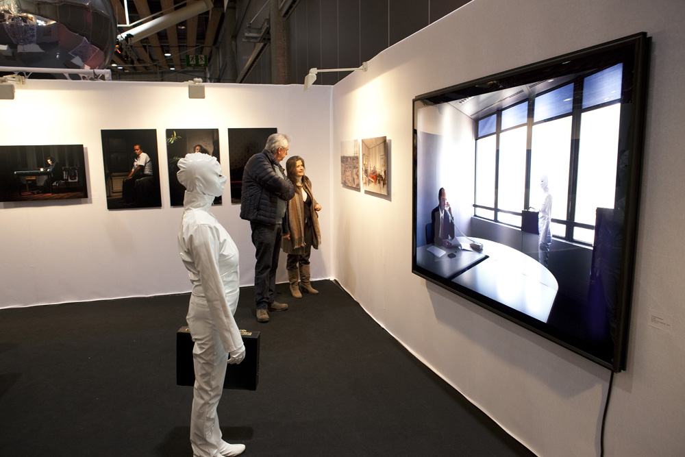 Les apparitions de personnage Blanc dans l’espace public dans le sujet de l’art ont le but de créer un décalage entre la réalité et l’œuvre irrévocable. La silhouette délibérée comme l’œuvre vivante laisse se poursuivre avec des spectateurs. L’action documentée par des photos en collaboration avec François Ronsiaux.